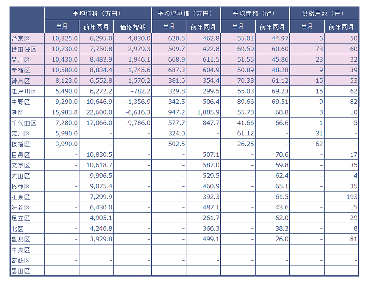 当社が調査した2024年8月の東京23区、行政区別分譲実績データ(速報値)です。