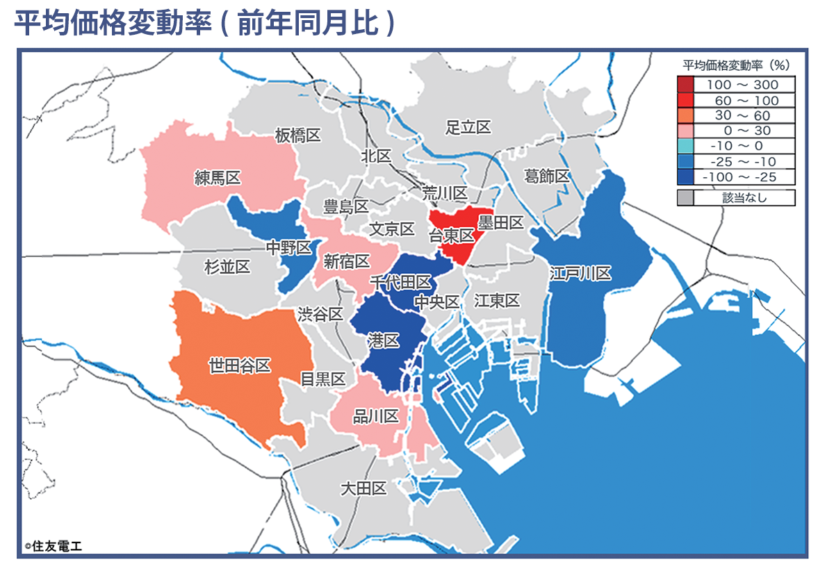 地図の各行政区ごとの色の違いは、同行政区における平均価格の前年同月比(平均価格変動率)の程度を表しています。