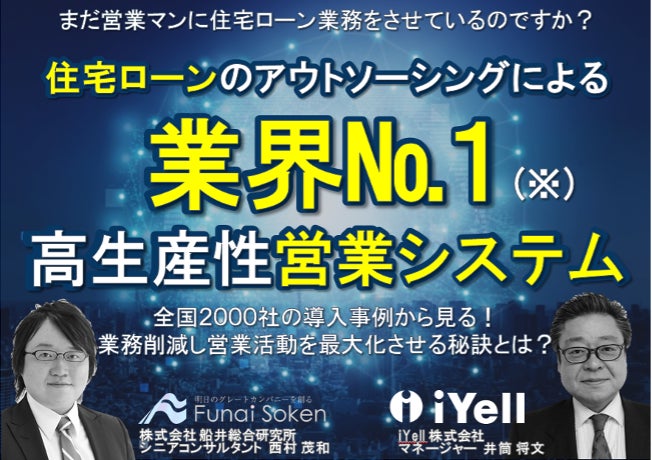 2022年3月15日(火)、テクノロジーを利用して最適な住宅ローンを提供する住宅ローンテックベンチャーのiYell株式会社(本社:東京都渋谷区、代表取締役社長 兼 CEO:窪田光洋、以下「iYell」)は、工務店・建築業界の成長をサポートするため、無料ウェビナー「住宅ローンのアウトソーシングによる業界No.1高生産性営業システム~全国2000社の導入事例から見る!業務削減し営業活動を最大化させる秘訣とは?~」を開催いたします。