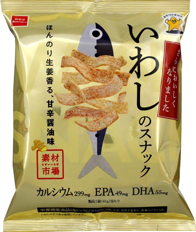 さらに美味しくなった『素材市場 さばのスナック』『素材市場 いわしのスナック』は、おやつやおつまみなど、日常の様々なシーンに手軽に取り入れやすい新感覚のスナック菓子です。