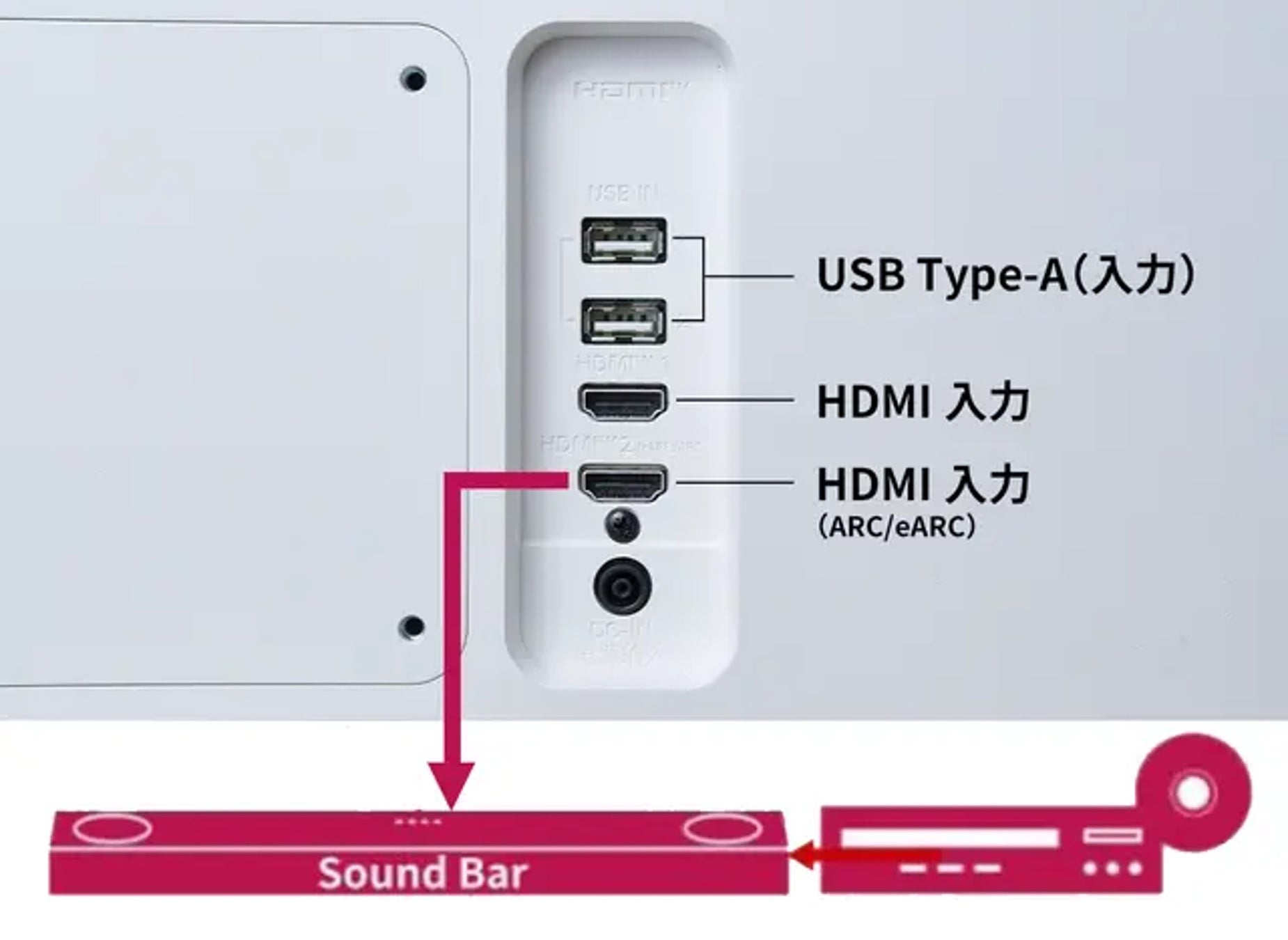 2つ搭載しているHDMI端子のうちのひとつは、eARCに対応。レコーダーやプレーヤー、ゲーム機、パソコン、サウンドバー、テレビチューナーなど、幅広い外部機器と接続でき、用途に合わせてカスタマイズが可能です。