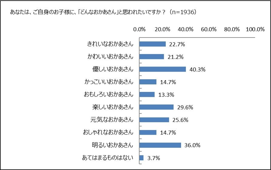 ご自身のお子様に、どんなお母さんと思われたいか聞きました。(選択肢の中で3つまでの選択制ですので、合計が100%にはなりません。)「優しい」40.3%、「明るい」36%、「楽しい」29.6%と性格の印象に関わるワードが上位を占めました。外観に関わるワードでは、「きれい」22.7%、「かわいい」21.2%、同率で「かっこいい」14.7%、「おしゃれ」14.7%となりました。