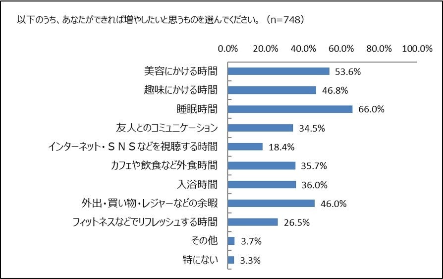 家事・育児と仕事の両立のために、何らかの時間を減らしていると答えた748名に、できれば増やしたい時間を聞きました。(選択肢の中で3つまでの選択制ですので、合計が100%にはなりません。)最も増やしたいと答えた時間は、「睡眠時間」で、66.0%。最も多く「減らしている」と答えた「美容にかける時間」を増やしたいと答えたのは、53.6%で、「減らしている」と答えた人よりも「増やしたい」と答えた人の方が多い割合となりました。減らしている意識がない人でも増やしたいと思っている深層心理が伺えます。