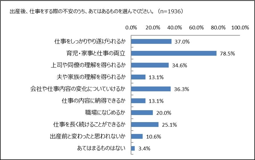 圧倒的な1位は、「育児・家事と仕事の両立」で78.5%と8割に迫ります。続いて「仕事をしっかりやり遂げられるか」で37%、「職場や仕事内容の変化についていけるか」が36.3%と続きました。