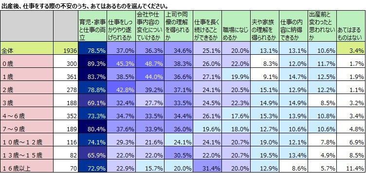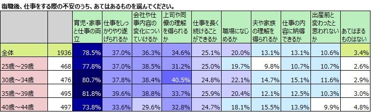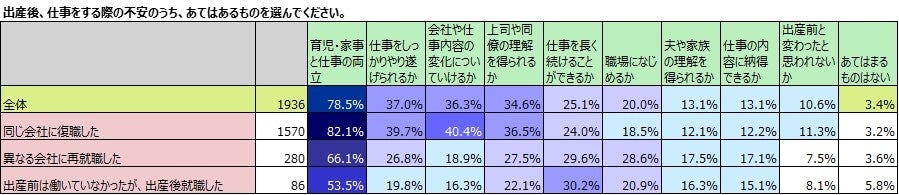 復職後の不安「家事・育児と仕事の両立」約8割。実は、同じ職場に復職した人の方が不安が多い。
