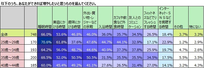 年齢別で見てみると、「美容にかける時間」を最も増やしたいと思っているのは、25歳~29歳の若年層で、年齢を重ねるほど、少なくなることがわかりました。「入浴時間」も若年層は、増やしたい割合が高く、高齢層になると割合が減っていきます。