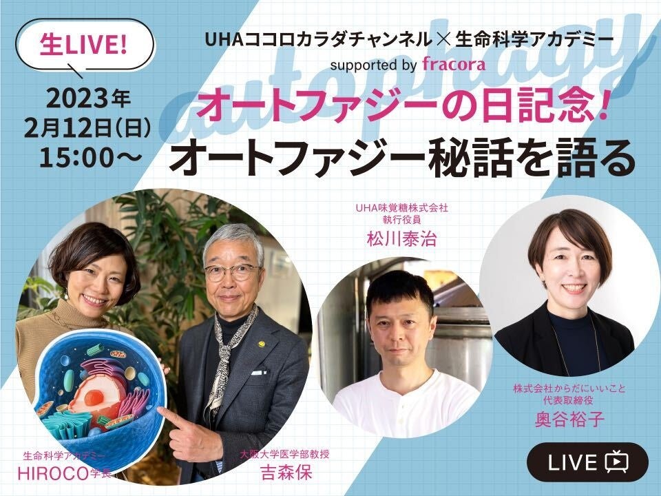 先端美容を追求し、エイジングケア美容液No.1(※)ブランドのfracora(フラコラ)運営「生命科学アカデミー」は、UHA味覚糖運営「ココロカラダチャンネル」と共に、大阪大学 医学部教授の吉森保先生ほか、豪華ゲストをお招きしたオンライン生配信イベント「2/12“オートファジーの日”記念!オートファジー秘話」を2023年2月12(日)15:00より開催いたします。