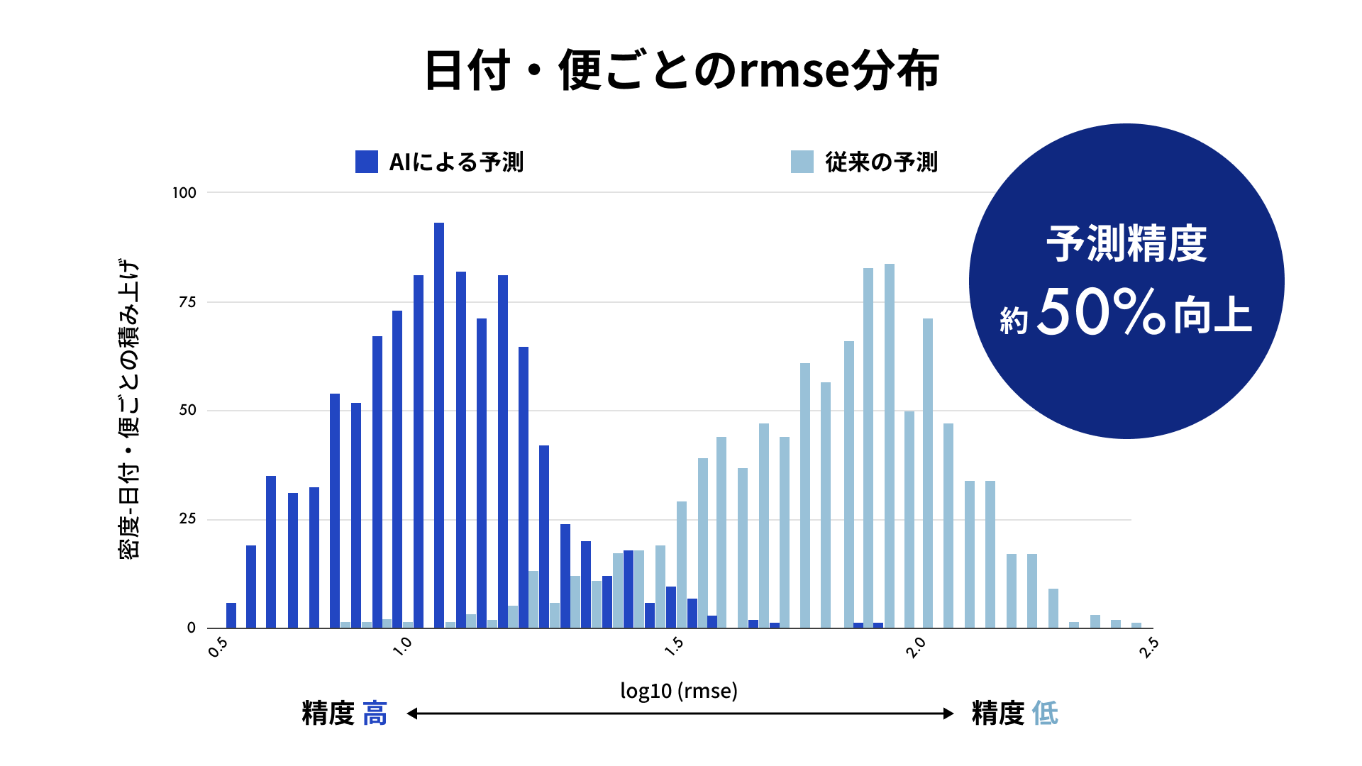 バス事業者が公開している、バスロケ情報から配信される遅延情報を過去数ヶ月分学習させ、遅延予測AIモデルを自社開発いたしました。開発にあたり、一つひとつの路線に対して遅れの傾向を分析し、傾向に合わせた機械学習モデルを選択し、パラメータチューニングを実施することで、停留所前後における遅延の推移を考慮しています。これにより、乗車人数が多いなど遅延の変動が大きい路線に対し、従来よりも50%高い精度で予測可能になりました。
