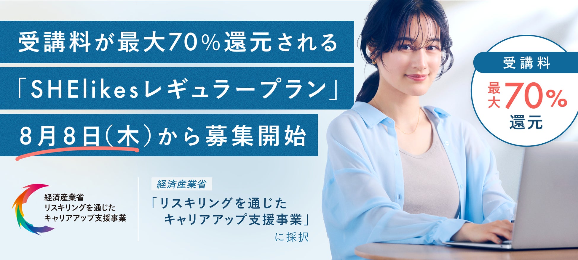 SHElikes、経済産業省「リスキリングを通じたキャリアアップ支援事業」に採択 受講料が最大70%還元される「SHElikesレギュラープラン」8月8日(木)から募集開始
