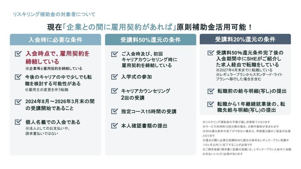 ・「SHElikesレギュラープラン」入会時および初回カウンセリング参加時に在職中(企業と雇用契約を締結)で、他企業へ転職(正社員、パート・アルバイトを含む、雇用主の変更を伴う転職)を目指しており、かつ個人名義で入会される方