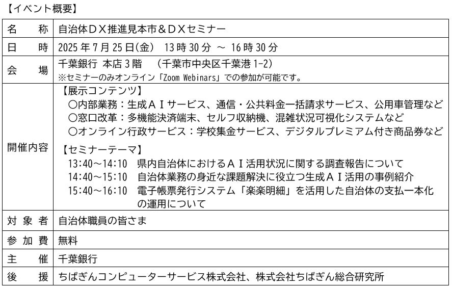 千葉銀行(頭取 米本 努)は、2025年7月25日(金)、デジタル技術の活用による行政サービスの高度化を支援するため、「自治体DX推進見本市&DXセミナー」を開催します。