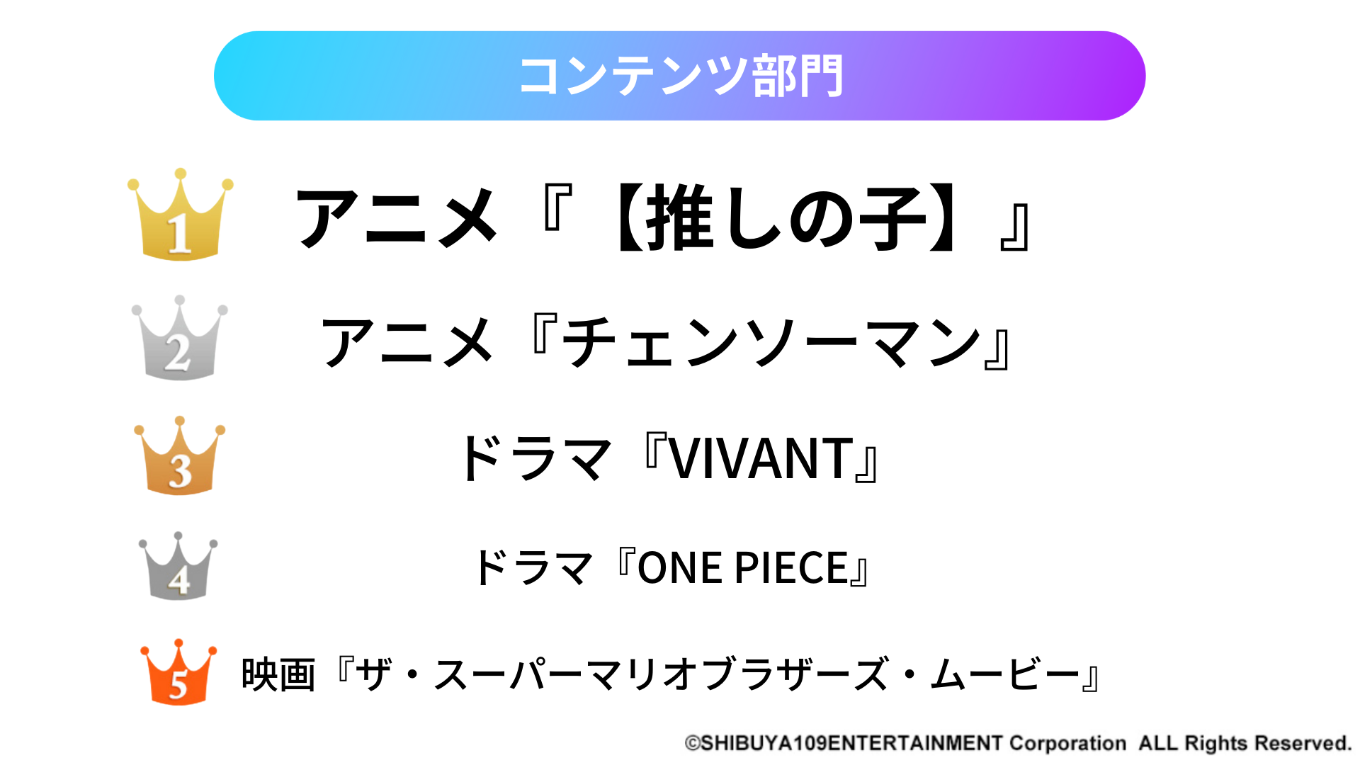 2023年9月にトレンド大会議を実施。SHIBUYA109 lab.の保有する独自ネットワーク「SHIBUYA109 lab.MATE」に所属する高校生・大学生10名とともにSHIBUYA109 lab.にて部門ごとにノミネートを選定。その後選択式アンケートを実施して大賞を決定。