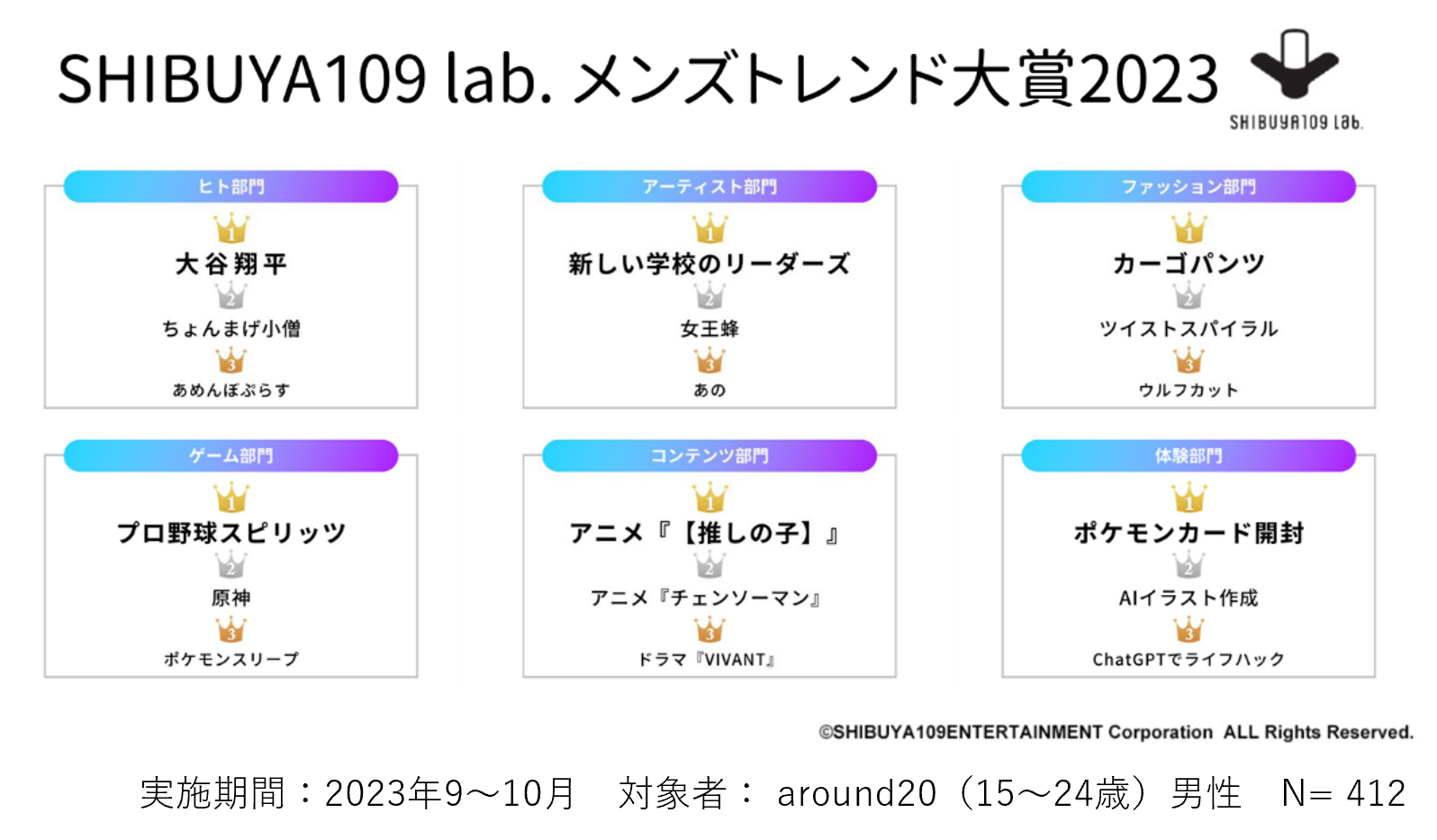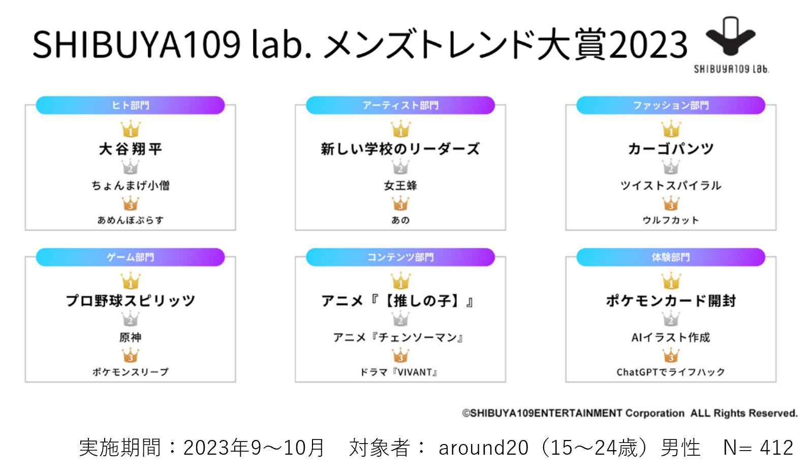 今年は新たにaround20(15~24歳)の男性412人を対象にWEB調査を実施。『SHIBUYA109 lab.メンズトレンド大賞2023』として発表いたします。
