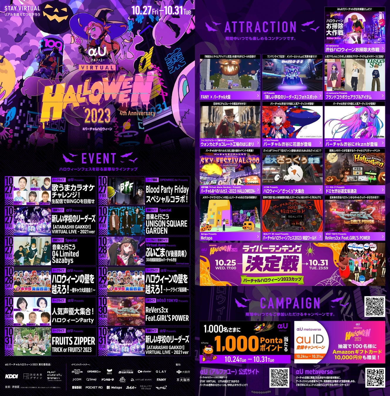 「バーチャル渋谷」のハロウィーンイベントは、2020年の初開催以来、総勢66組のアーティスト・ VTuber・アニメキャラクターが出演し、延べ130万人以上に参加いただきました。4年目となる今年は”Stay Virtual-リアルを超えてつながろう”をテーマに、「バーチャル渋谷」「バーチャル大阪」での音楽ライブなどのエンタメコンテンツに加え、KDDIのメタバース「αU metaverse」でアーティストや配信者(ライバー)と交流できるイベントを実施します。