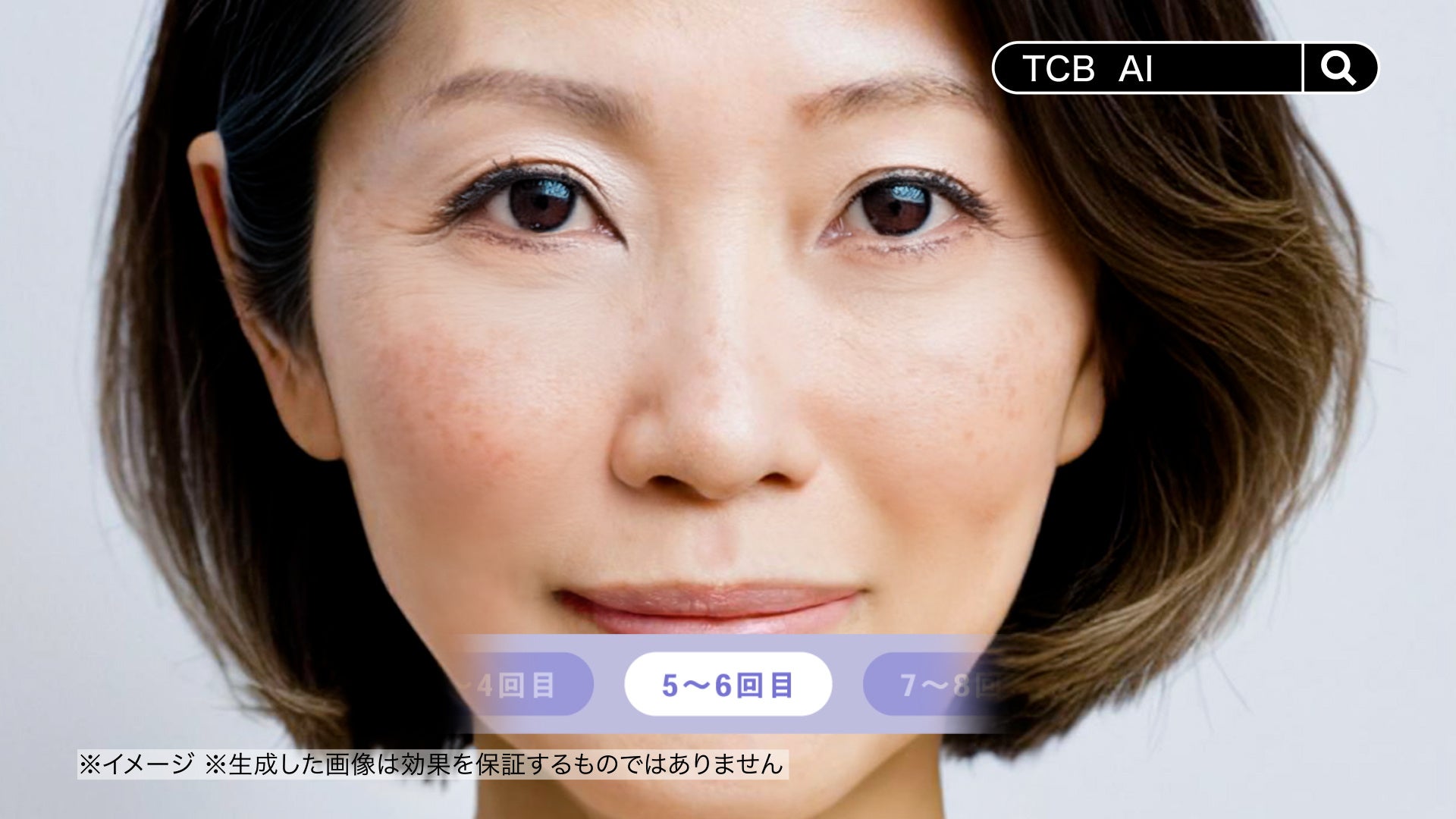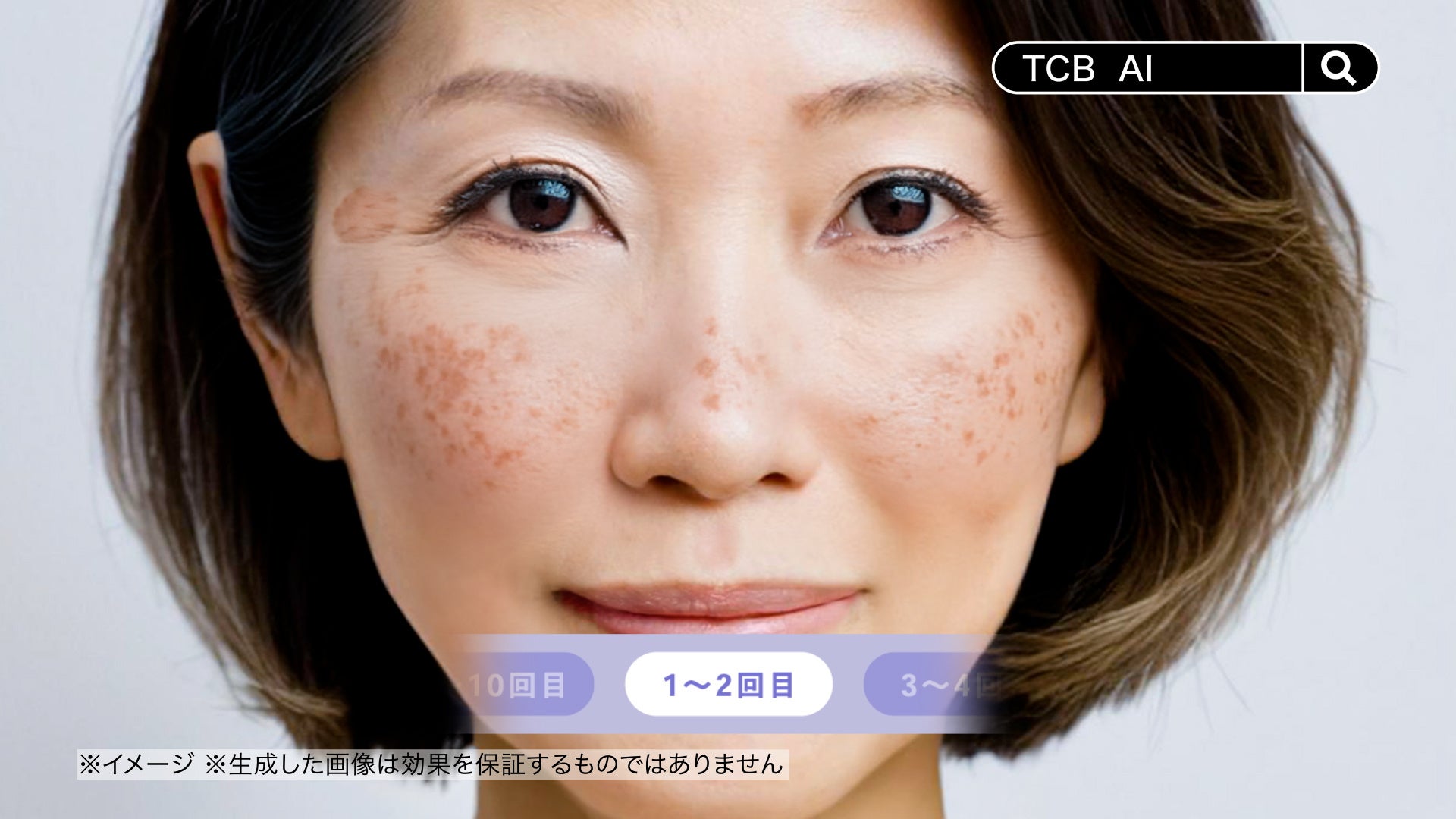 全編にわたって「TCB AI シミュレーター for エイジングケア」に追加されたシミ取り機能の使い方をご紹介。レーザー治療の照射回数を選択するとそれに応じて、実際の症例を学習したAIが女性の顔写真からシミ・肝斑・くすみが改善されたイメージを生成する様子を30秒動画にまとめました。