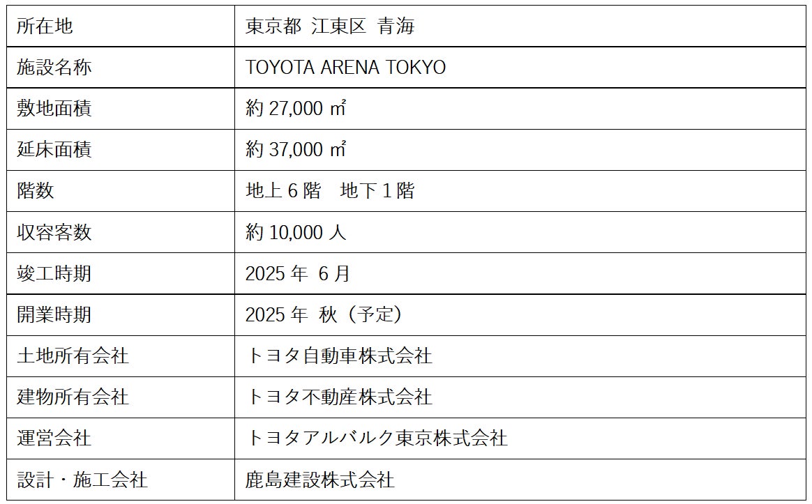 トヨタ自動車株式会社(以下、トヨタ自動車)、トヨタ不動産株式会社(以下、トヨタ不動産)、トヨタアルバルク東京株式会社(以下、トヨタアルバルク東京)の3社で協働して推進する「TOKYO A-ARENA PROJECT (以下、本プロジェクト)」は、2025年秋開業予定のお台場エリア「江東区・青海」に新設するアリーナの施設名称につき、トヨタ自動車がアリーナのネーミングライツ(命名権)を取得し、「TOYOTA ARENA TOKYO」とすることに決定いたしました。