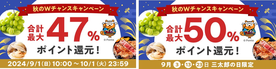 実施中のキャンペーンや特典とあわせると合計最大47%のポイント還元、さらに三太郎の日(2024年9月3日、13日、23日)やポイント超超祭(2024年9月5日から9月11日)なら合計最大50%のポイントを還元します。