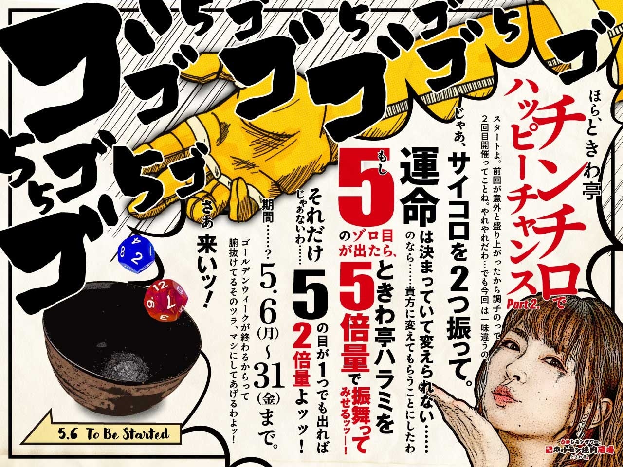 GOSSO株式会社(本社:東京都渋谷区、代表取締役:藤田建、以下 当社)は、「0秒レモンサワー® 仙台ホルモン焼肉酒場 ときわ亭」(一部店舗を除く)にて、5月6日(月)~5月31日(金)の期間限定で、アプリ会員向けに、「チンチロハラミ」ご注文いただくとチンチロチャレンジできる『チンチロでハッピーチャンスpart2.』を開催いたします。5月にちなんで、2つのサイコロを振って、5が1つ出たらハラミ2倍量、5のゾロ目ならハラミ5倍量にサービスします。https://zero-tokiwa.com/