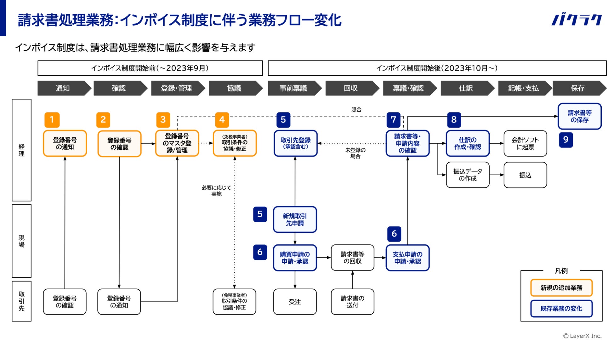 インボイス制度開始に伴い、仕入税額控除を受けるには適格請求書発行事業者(以下「登録事業者」)が発行した適格請求書(以下「インボイス」)を受け取る必要がありますが、制度開始前後で請求書処理業務には以下のように種々な業務フローの変化が生じます。