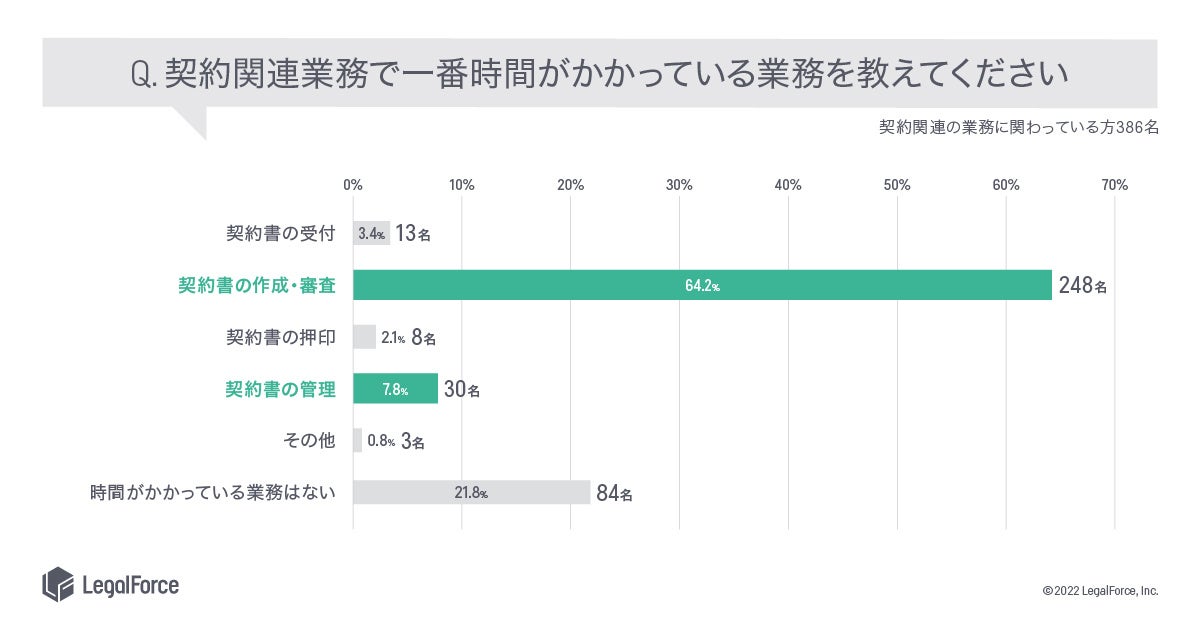 ・契約関連業務で一番時間がかかっている業務は「契約書の作成・審査」が64.2%で最多、次いで「契約書の管理」が7.8%