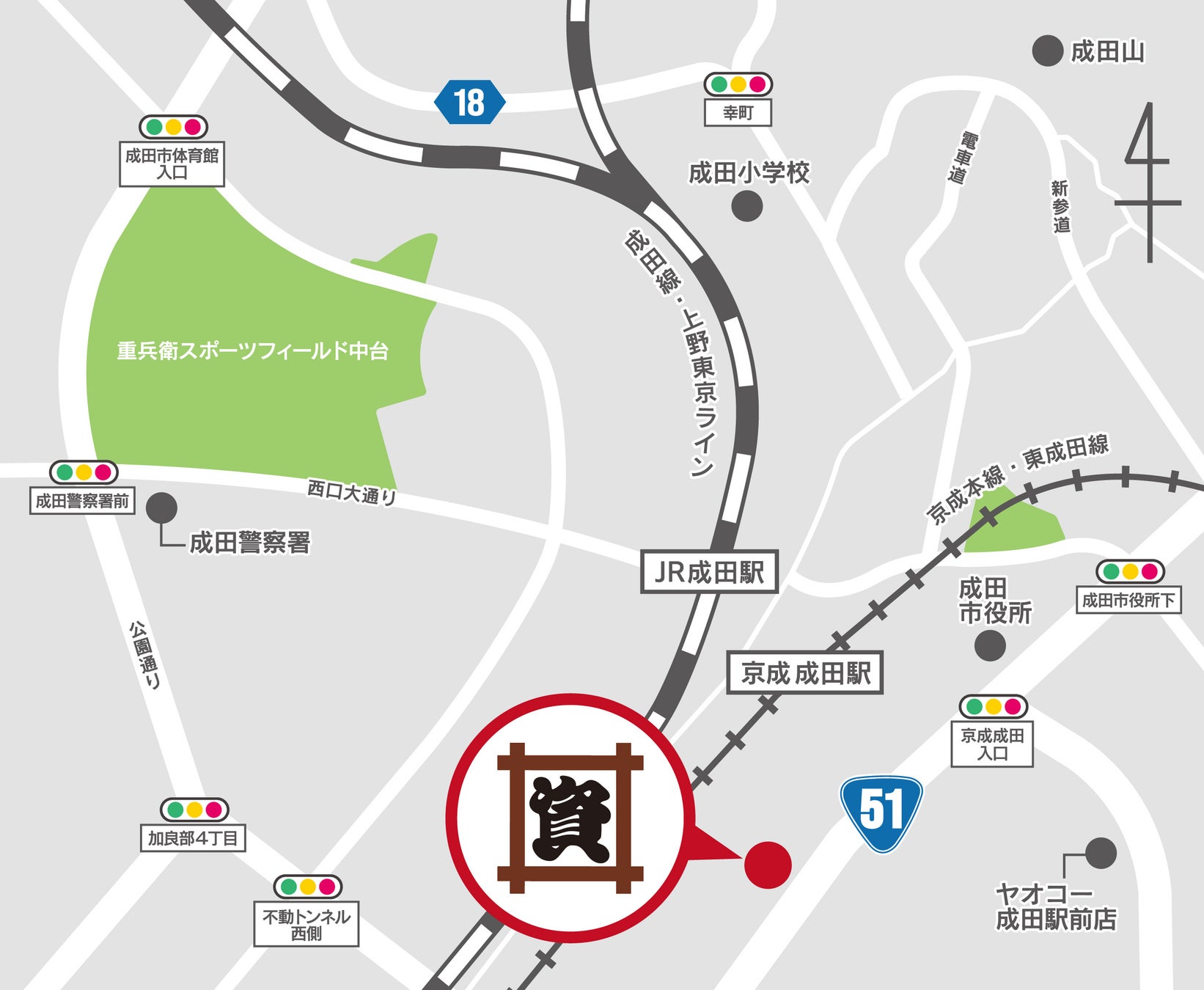 「資さんうどん成田店」は、国道51号線沿いに位置します。成田国際空港や成田ICからも車で約10分圏内にあるため、地域の方はもちろん、空港利用者やドライバーの方にもご利用いただきやすい環境です。また、JR成田駅、京成成田駅からもそれぞれ徒歩10分程度と公共の交通機関でも便利にご来店いただけます。店舗周辺には大型商業施設や、銀行・医療機関・飲食店などが集積し、買い物や生活利便性の高いエリアとなっています。