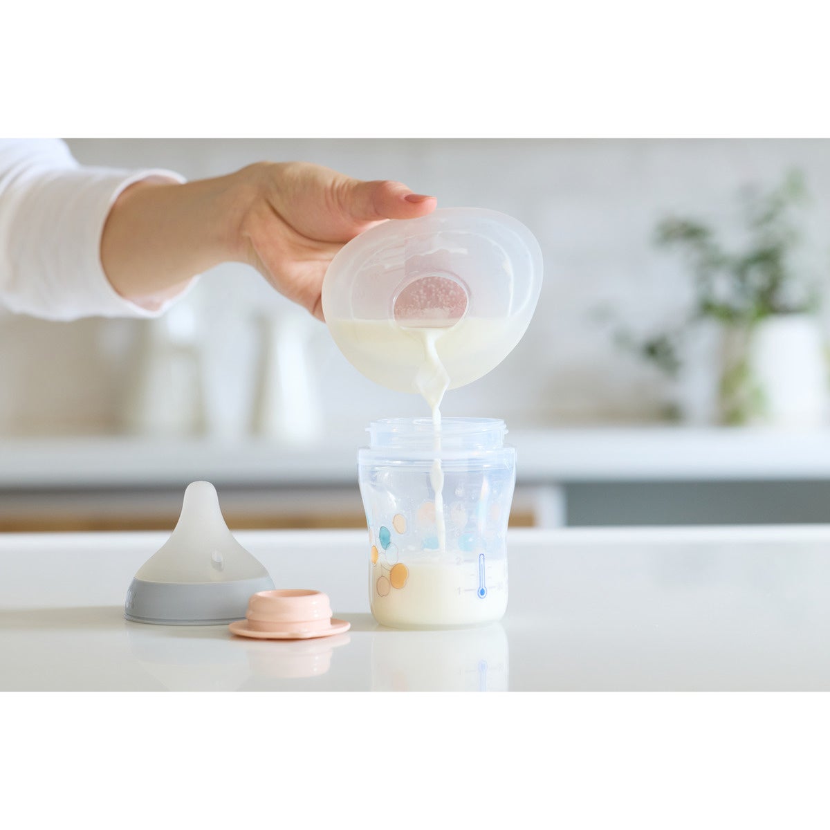 注ぎ口付きで、集めた母乳をスムーズにほ乳びんへ移せます。キャップ付きで冷蔵庫での一時保存(24時間以内)も可能です。