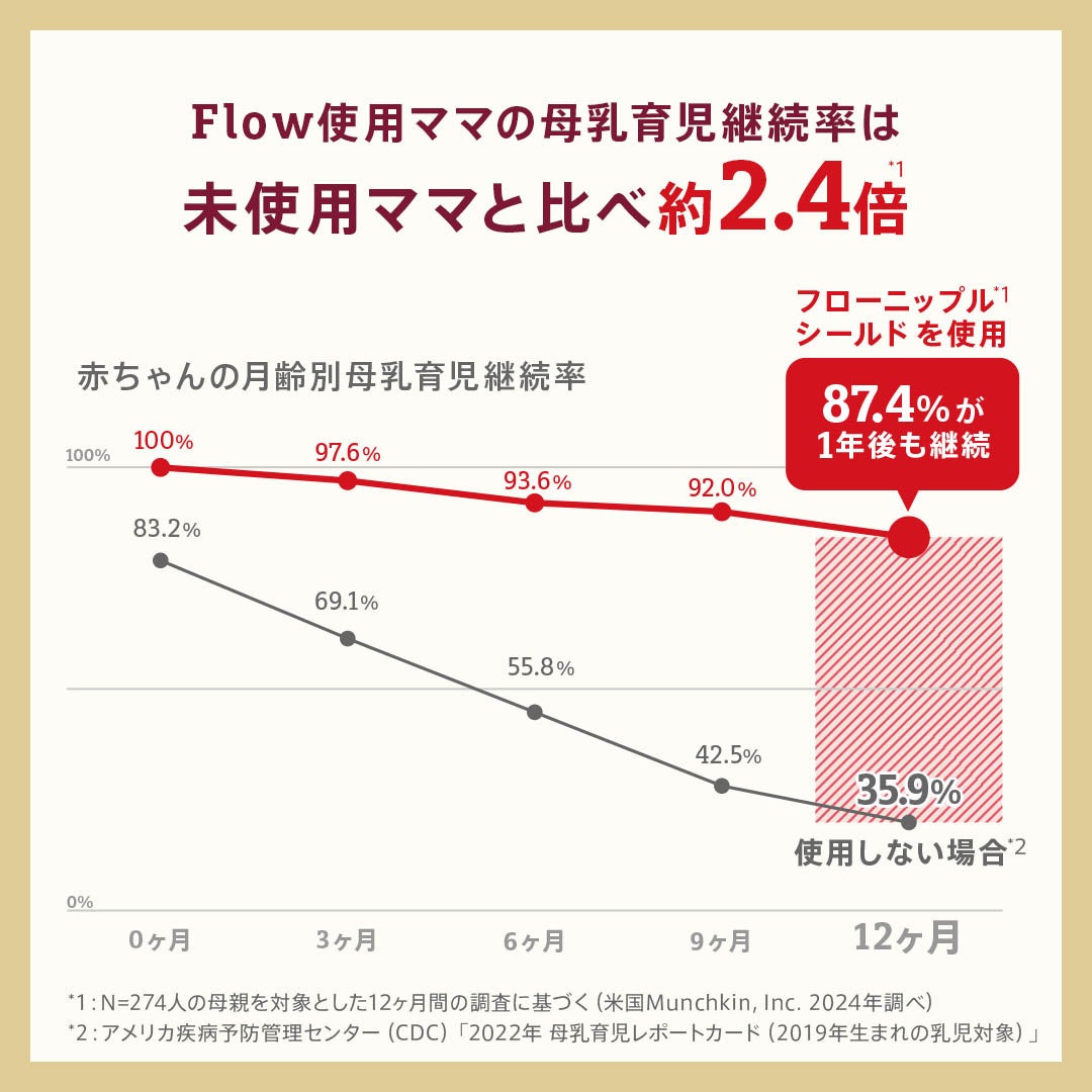 ・Flowを使用したママの87%が12ヶ月後も母乳育児を継続※1(一般平均は約36%※2)