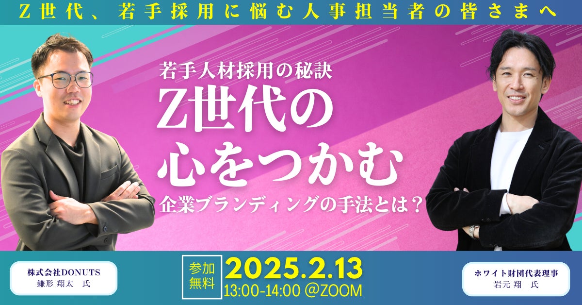 ホワイト企業認定を展開する一般財団法人 日本次世代企業普及機構(本部:大阪市北区、代表理事:岩元翔)は、株式会社DONUTS ジョブカン プロダクトマネージャー 鎌形翔太氏を迎え、ホワイト財団代表理事 岩元翔が「Z世代の心をつかむ企業ブランディングの手法とは?」についてのウェビナーを開催します。