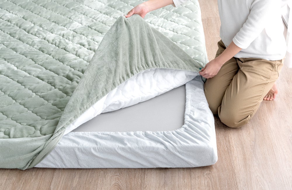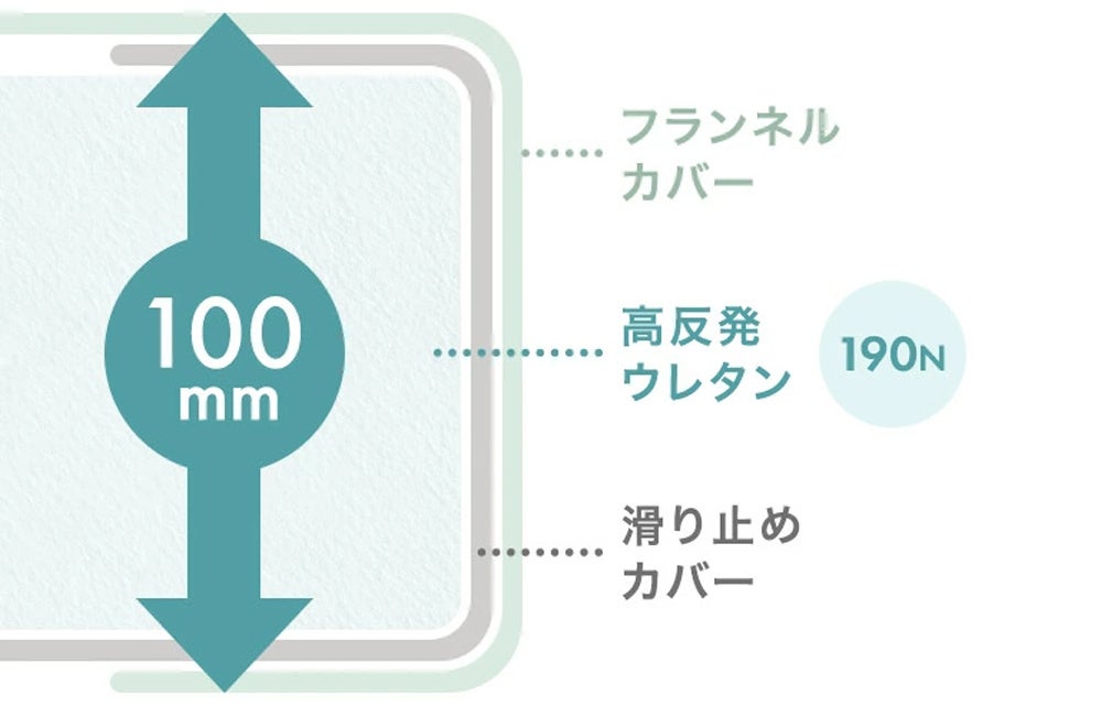 <フランネルカバー> 表地・マチ:ポリエステル100%(目付け…180g/m2)、マチ裏面樹脂加工(ピリング防止) 中綿:ポリエステル100%(150g/m2、抗菌防臭防ダニ加工) 裏地:ポリエステル100%(75g/m2、ピーチスキン) <滑り止めカバー> ポリエステル100%(150g/m2、両面滑り止め加工) <ウレタン> 190N高反発ウレタン(25D、復元率98.7%) |