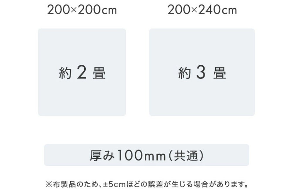 200×200cm 200×240cm 厚み:10cm ※布製品のため、±5cm程の誤差が生じる場合がございます。 |