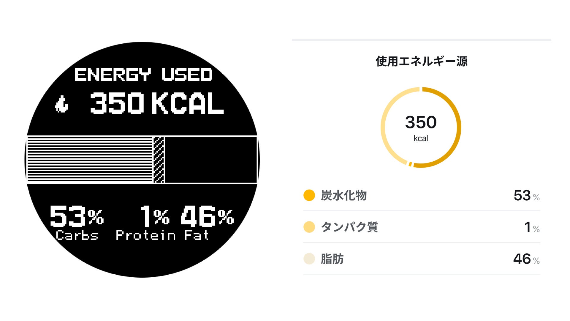 トレーニングによって消費されたエネルギーのうち、三大栄養素(炭水化物、タンパク質、脂質)の各消費量を比率で算出ます。トレーニングを行う際の各栄養素の摂取や、目的に応じた運動強度設定の目安として活用できます。