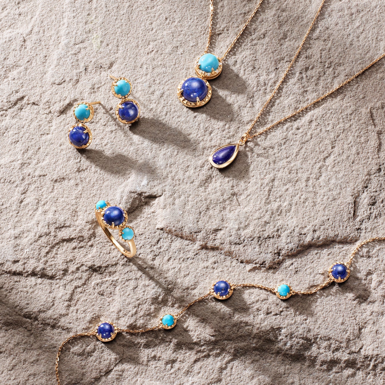 ピアス¥110,000(K18YG,ラピスラズリ,ターコイズ)/ネックレス¥149,600(K18YG,ラピスラズリ,ターコイズ,ダイヤモンド)/リング¥110,000(K18YG,ラピスラズリ,ターコイズ)