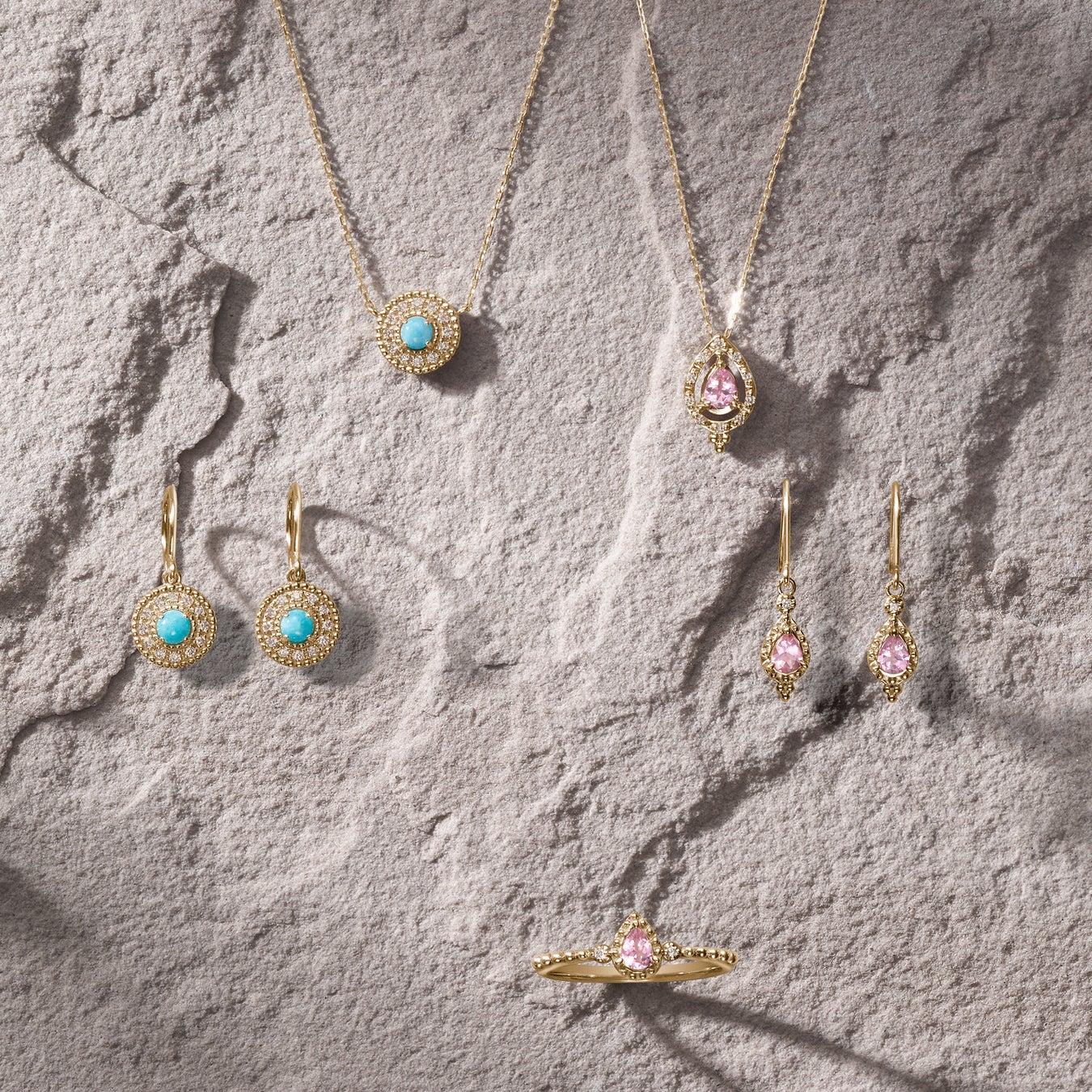 さまざまな国の伝統を感じさせる繊細な加工や色彩を、美しい色合いのカラーストーンと落ち着いた輝きを持ったブラウンダイヤモンドで表現したジュエリー。石の周囲にあしらわれたミルグレインは粒金細工のような繊細さとエキゾチックな雰囲気を感じさせ、デザインのアクセントに。