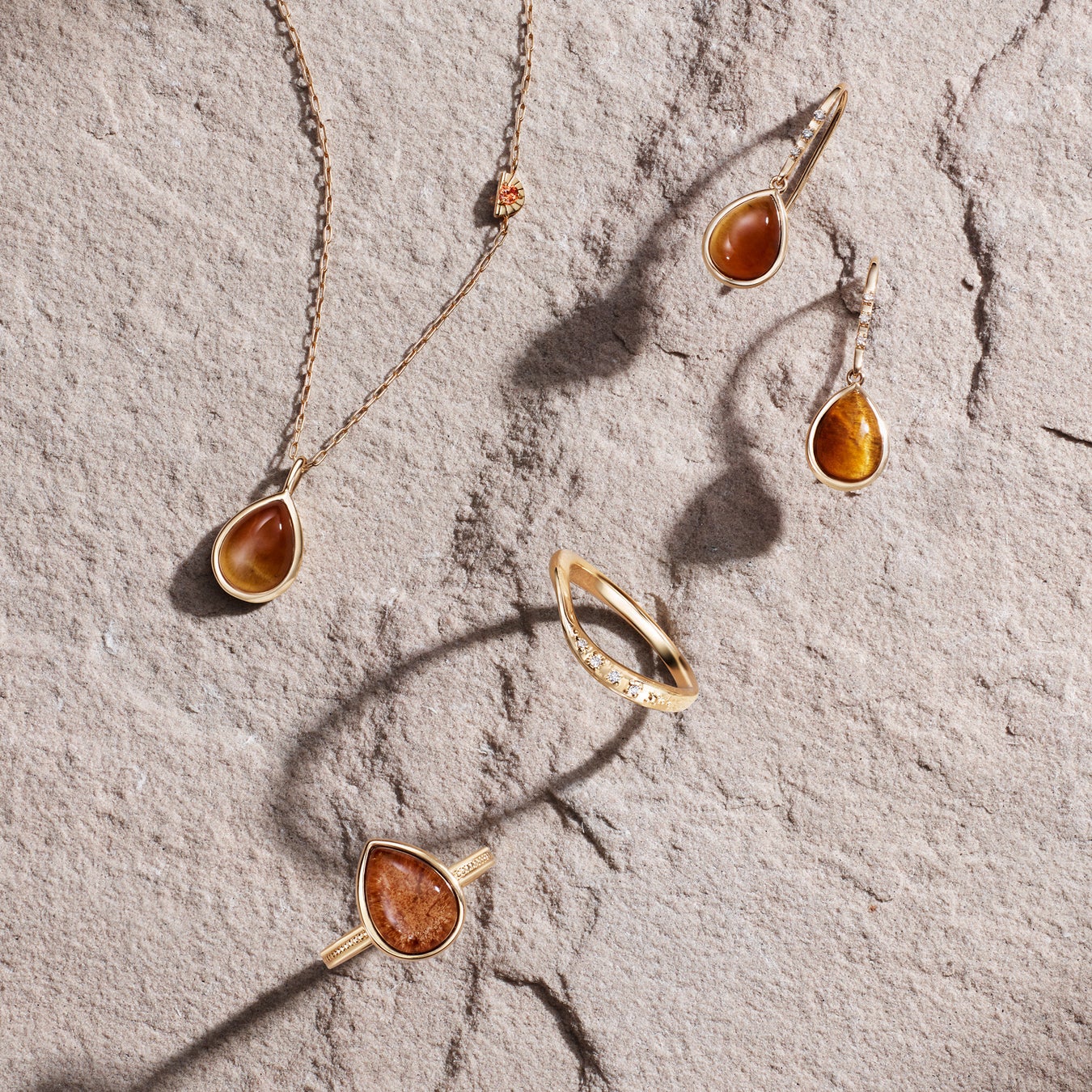 ピアス¥59,400(K18YG)/ネックレス(上から)/¥72,600(K18YG,カーネリアン)/¥143,000(K18YG)/¥123,200(K18YG,タイガーアイ,クォーツ,オレンジサファイア)/リング(上から)/¥134,200(K18YG,タイガーアイ,クォーツ)/¥88.000◆(K18YG,ダイヤモンド)