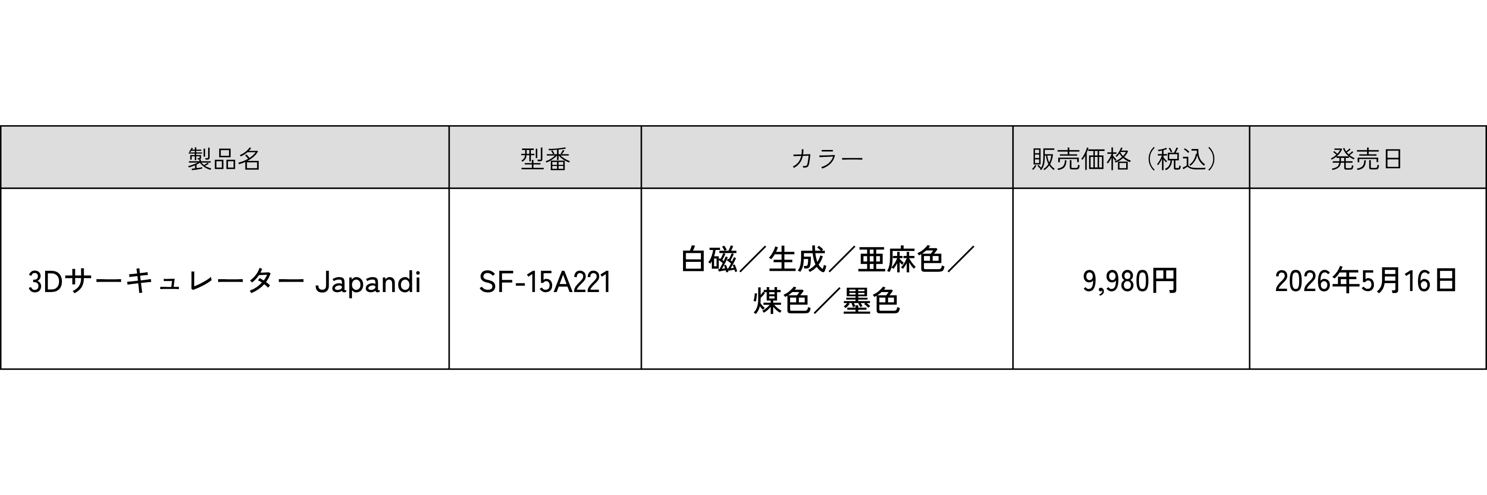 シロカ株式会社(東京都・千代田区)は、昨年発売した「3Dサーキュレーター(SF-15A221)」の第2弾として、日本の“侘び寂び”と北欧の“ヒュッゲ”を融合させたインテリアスタイル、「Japandi(ジャパンディ)」をテーマとしたニュートラルな5色展開で、お部屋の雰囲気や好みに合わせてカラーをお選びいただける「3D サーキュレーター Japandi(ジャパンディ)」を、シロカ公式オンラインストア限定で2026年5月16日に発売します。