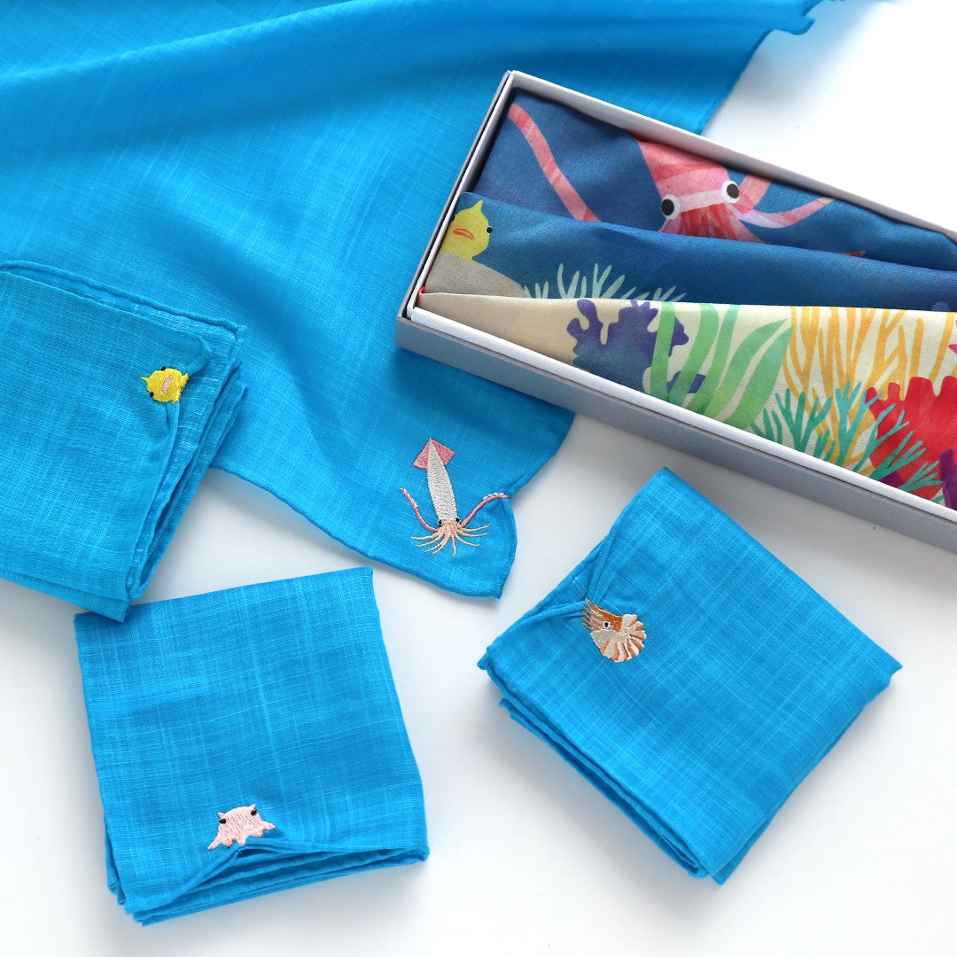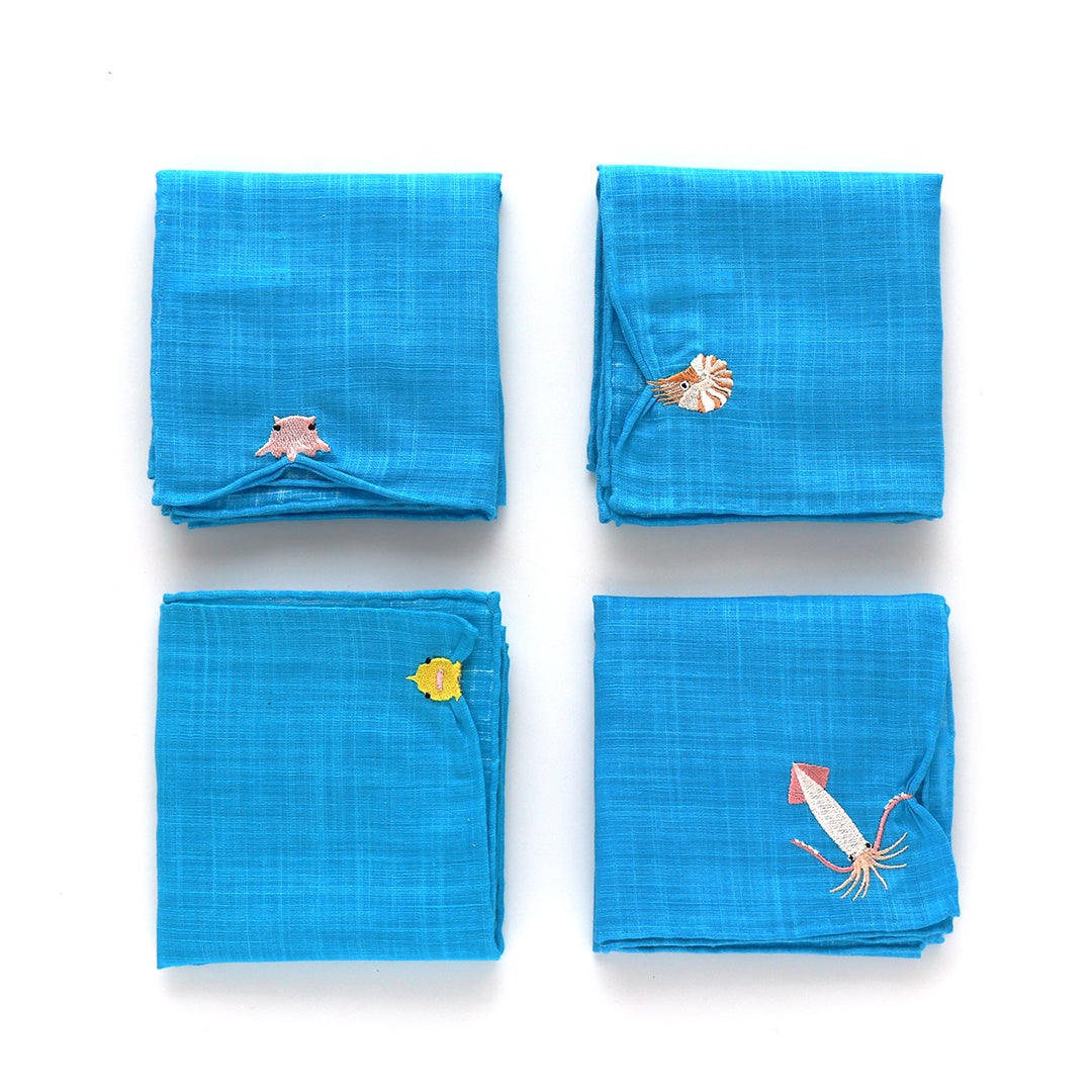 それぞれの深海魚が、ハンカチの縁にくっついたりひっぱったりしている姿を刺繍で表現したユニークなハンカチーフ。