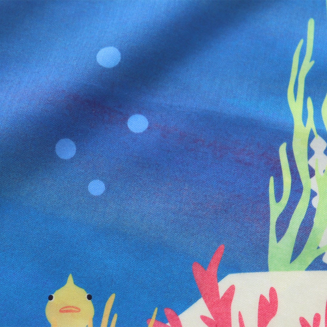 水深200メートルより深い海域に住む魚たち。そんな深海魚たちのいる神秘的な海の世界を、切り絵のようなイメージでデザインした鮮やかな一枚です。