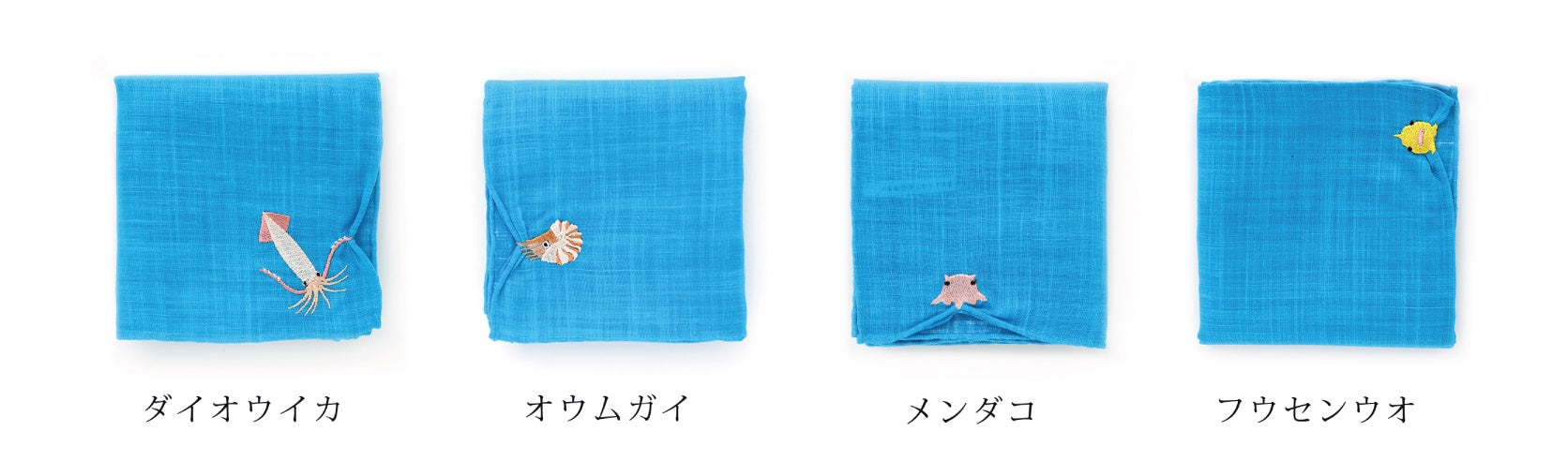 ブランド創設以来、数々のハンカチーフのデザインを手掛けるデザイナー徳田祐子さんによる新作がこの夏5柄登場!独特なフォルムがグロテスクなようでいて可愛らしさもある「深海魚」に着目した、夏におすすめの一枚です。様々な動物がハンカチーフの縁を引っ張る姿を、ユーモラスにワンポイント刺繍で表現した人気の「HIKKOMI(ひっこみ)」シリーズに、巨大なダイオウイカをはじめ、ひらひらと泳ぐメンダコなどが仲間入りします。この他、深海魚たちのいる世界を切り絵のようなイメージでデザインしたプリントハンカチーフも同時に販売します。