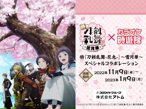コロワイドグループの株式会社アトム(本社:神奈川県横浜市、代表取締役社長:山角豪)は、カラオケ「時遊館」25店舗で、2023年1月18日(水)に劇場3部作のBlu-ray・DVDの発売が決定した、アニメ「特『刀剣乱舞-花丸-』~雪月華~」とのコラボレーションキャンペーン(以下「コラボ」)の第参弾を、2022年11月9日(水)より開催します。