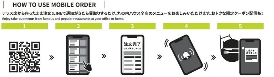 「丸の内ハウスモバイルオーダーエリア」のお好きな席についたまま対象の店舗でテイクアウトメニューを注文できるテーブルオーダーシステム。二次元コードからLINEで友だちを追加後、メニューを選択して注文することができます。商品完成後LINEのメッセージで通知が届くため、丸の内ハウス内のどこにいてもすぐにお呼び出しでき、各店の「TO GOカウンター」で、できたての商品を受け取ることができます。(店舗によりオーダー可能時間が異なります。)