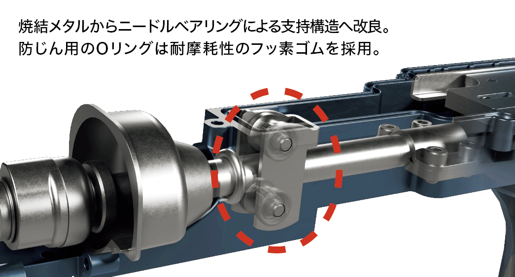 先端軸受け部をローラーにすることにより摩擦による摩耗・発熱が従来製品※より軽減され、軸受け部分の耐久性が向上しました。