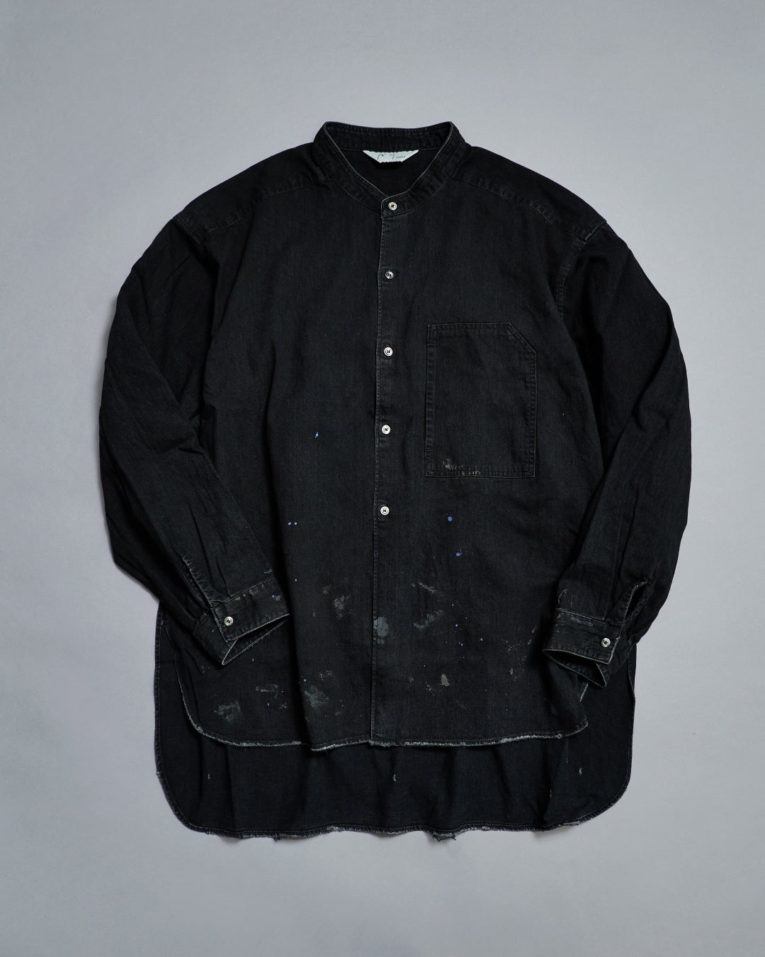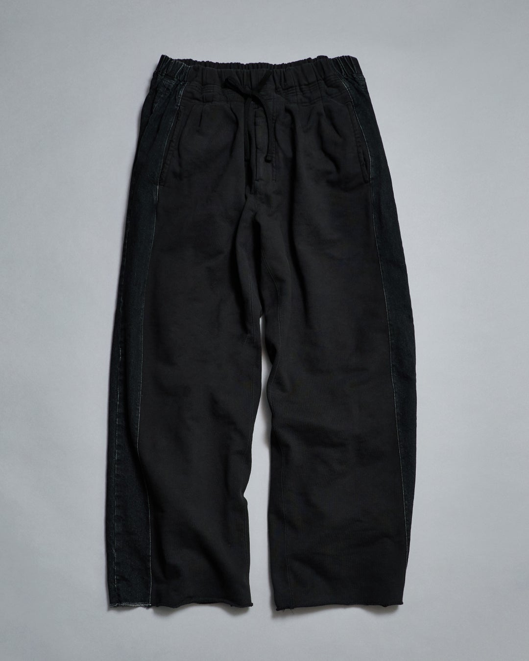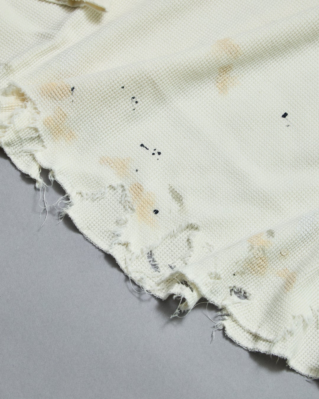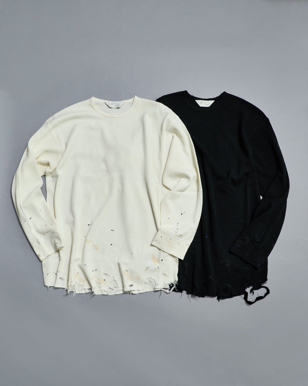 アーカイヴを復刻し、サイジングやダメージディテールなどをアップデートした”カラーレスデニムシャツ“は、日常づかいでの経年変化をイメージし、ダーティーになりすぎない程度のペイントをあしらったもの。ブランドのコアアイテムとも言える“ダメージワッフルクルーロングスリーブシャツ”にも同様にペイントを飛ばし、二次加工の高さに定評がある<アンセルム>の美点を存分に詰め込み仕上げました。“スエットデニムハイブリットイージーパンツ”には、サイドに同色のデニム地の切り替えをほどこし、2つの素材の経年変化が楽しめる仕様に。全体のトーンを統一しながらも、素材のコントラストで奥行きを演出しているため、一着でも様になるパンツです。
