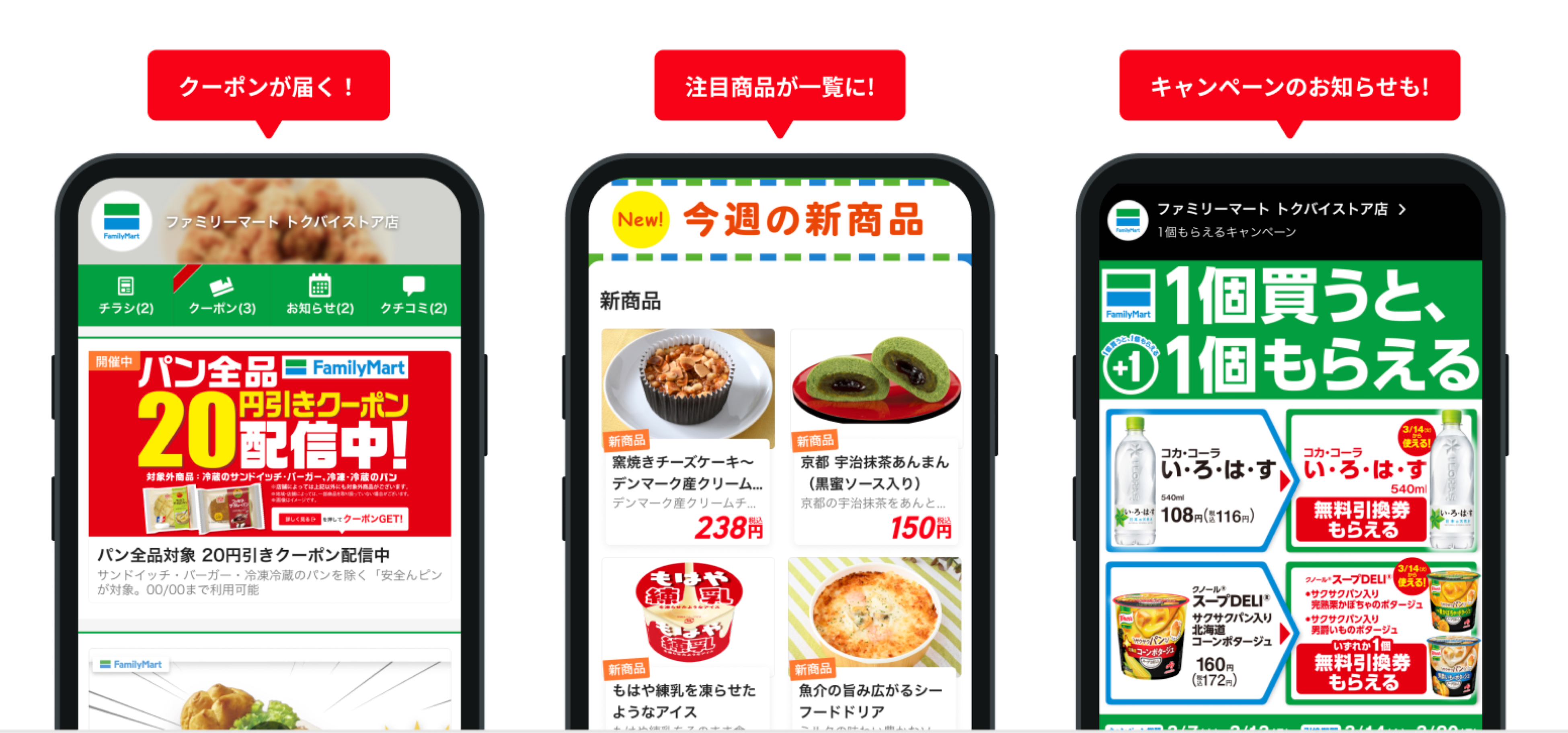1個買うと1個もらえるキャンペーンやポイント2倍デーのお知らせなど、キャンペーン情報もリアルタイムに発信していきます。
