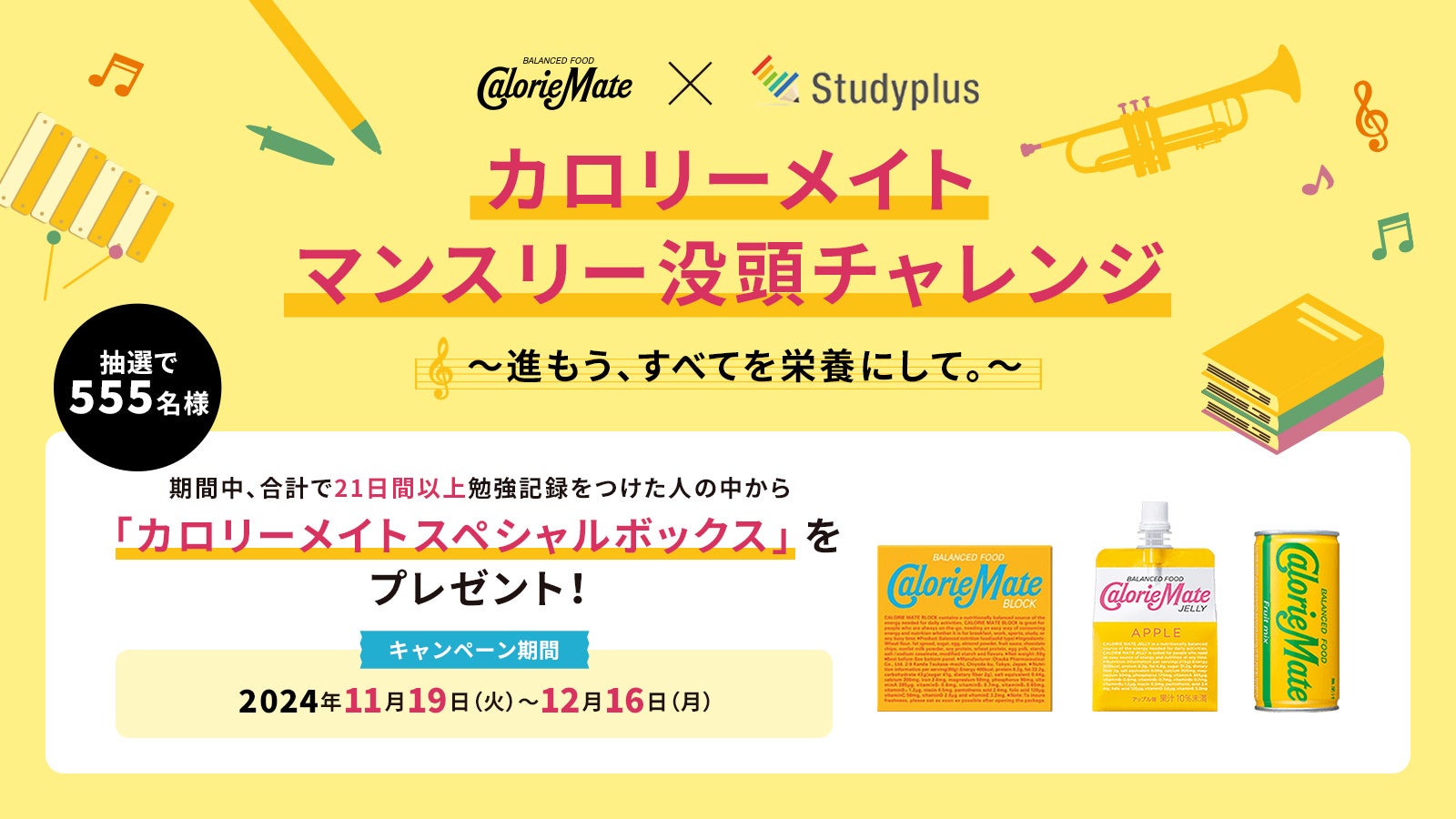 プレゼント:公式アカウント「カロリーメイト【公式】」をフォローして、期間内(2024年11月19日(火)〜12月16日(月))に21日以上勉強記録をつけた方から抽選で555名様に「カロリーメイト スペシャルボックス」をプレゼント!