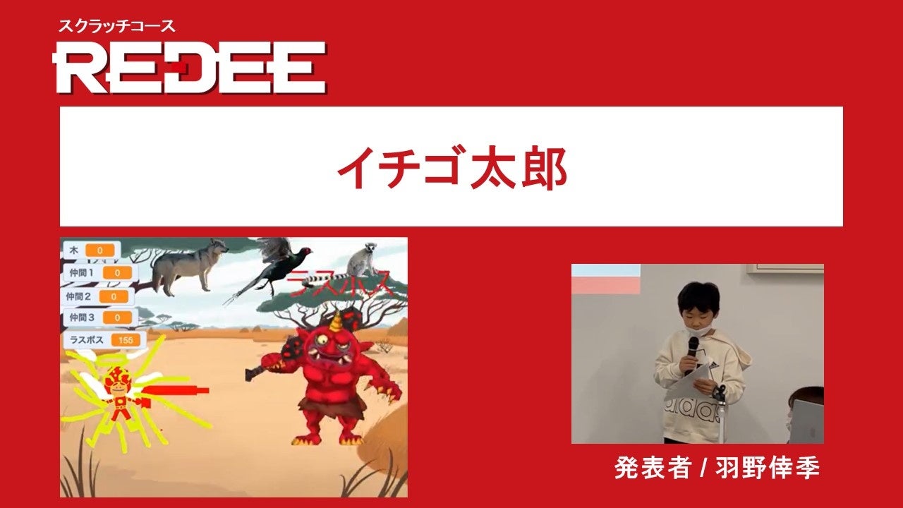 3ヶ月単位で開講しているプログラミングスクール受講生を対象にした本発表会は、6名の参加者がグランプリを目指し、保護者や関係者の前で学習の成果を発表しました。グランプリには小学3年生の羽野倖季さんが作った「イチゴ太郎」が輝きました。