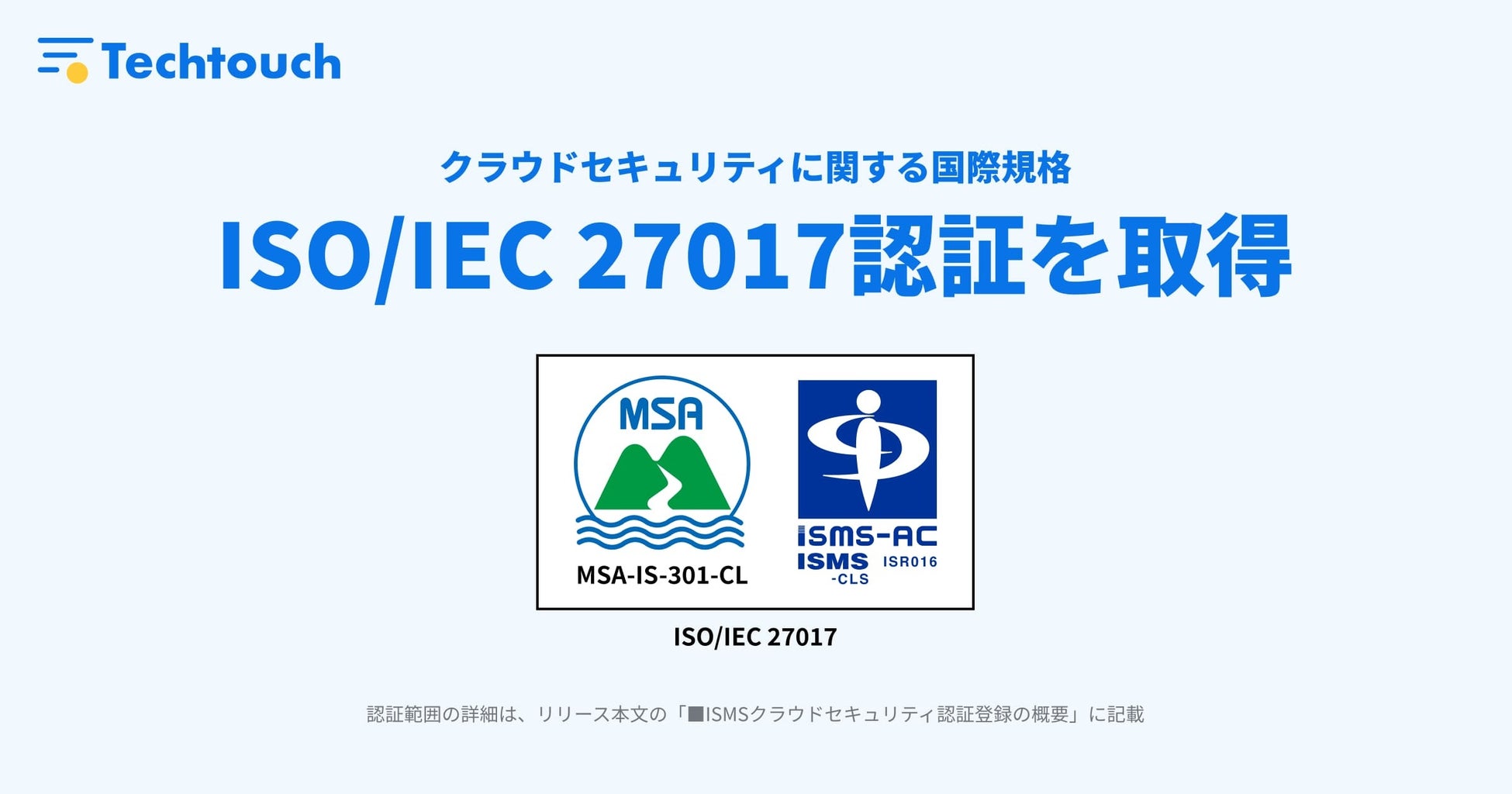 「テックタッチ」、クラウドセキュリティの国際規格「ISO/IEC 27017」認証を取得
