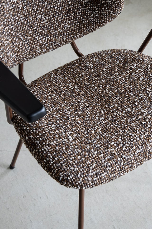 エッジの効いたスチール脚が印象的なアボックチェアにポップなカラーリングのシリーズが追加になりました。張地には、複数の色を織り交ぜた表情豊かなNSA生地を採用。太めの糸を合わせて織り上げた、麻混の織物のような柔らかく立体感のあるマチエールが特徴です。今回の追加により、アボックチェアのバリエーションは24種類へと拡充。インテリアや好みに合わせて自由な選択が可能です。