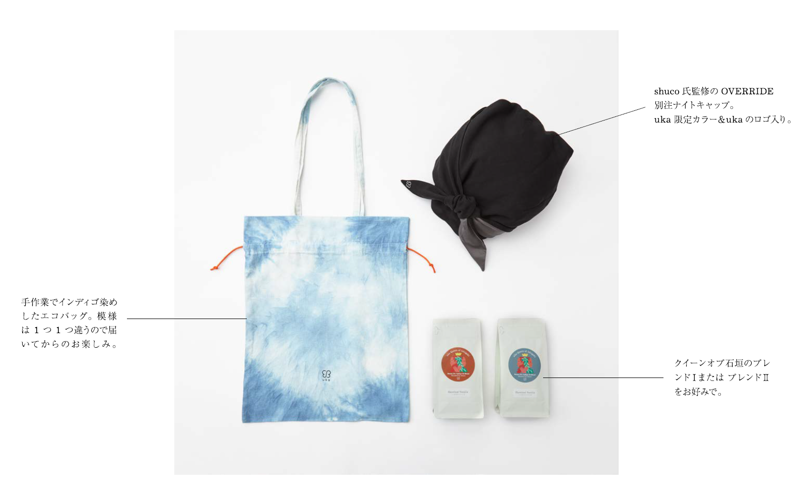 クイーンオブ石垣(ブレンドⅠ or ブレンドⅡ)と、shuco 氏監修のOVERRIDE別注ナイトキャップをセットに。オリジナルのエコバッグもお付けします。
