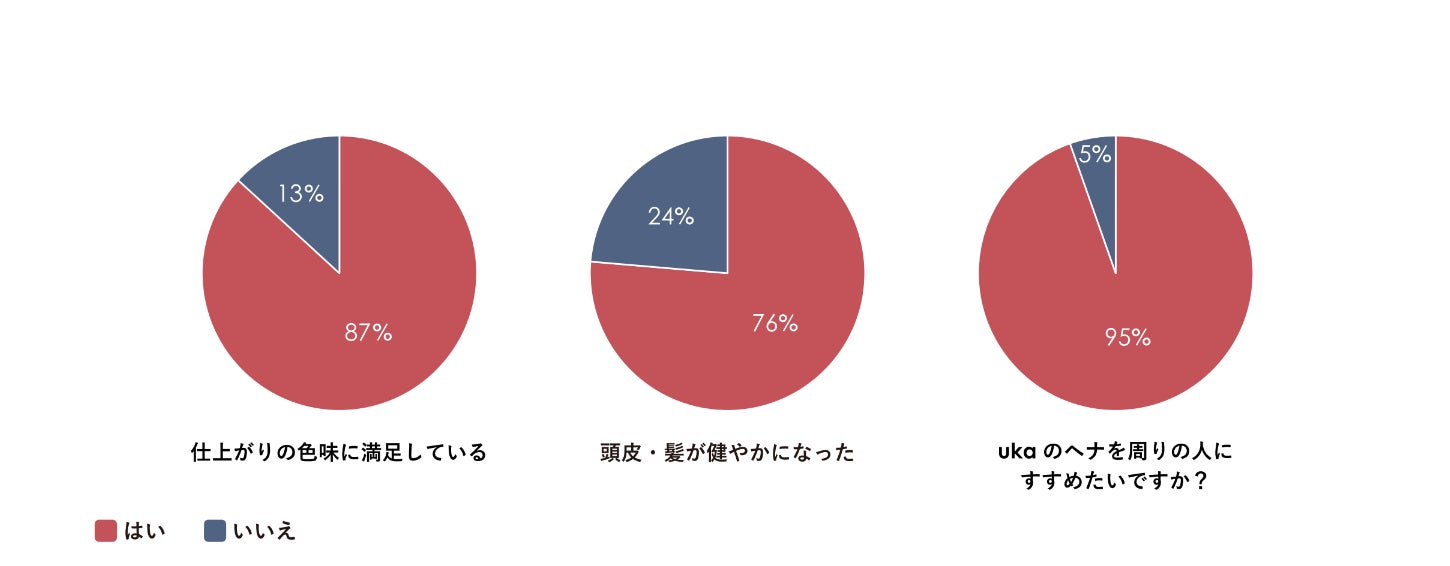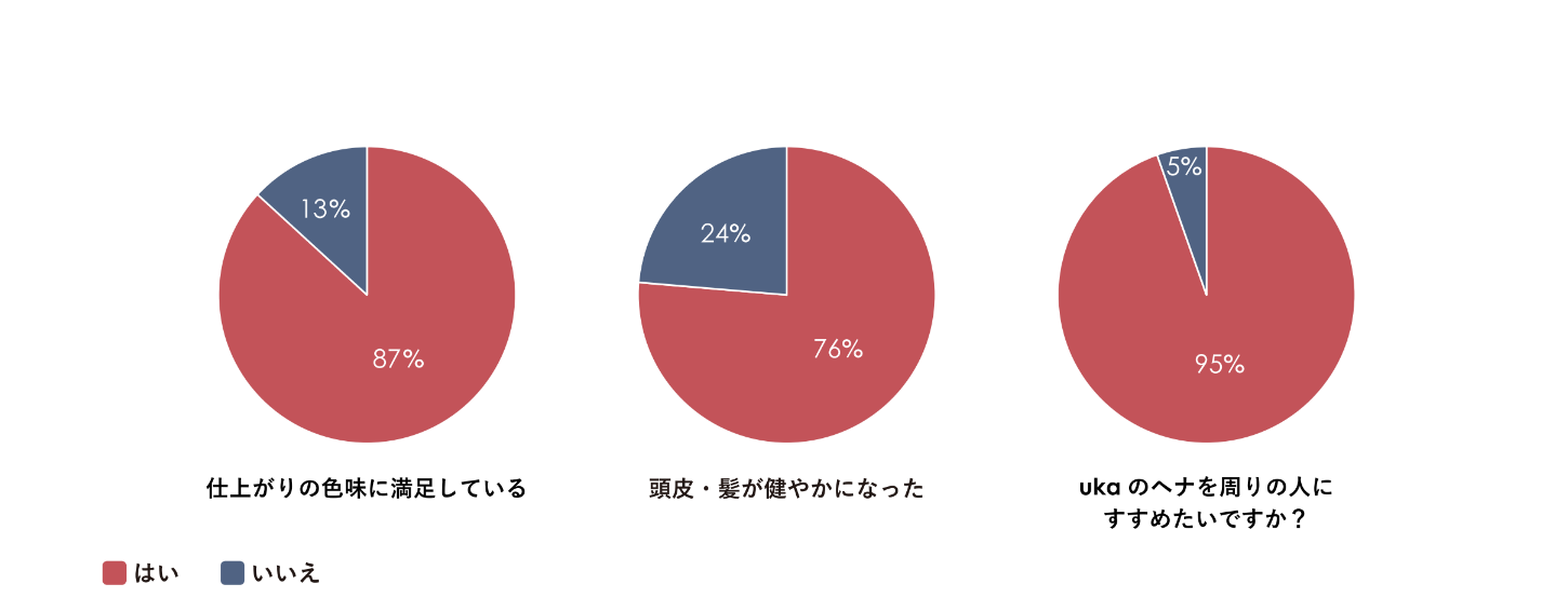 ウカサロンでの体験からスタートしたuka ヘナシリーズ。11月から約4ヶ月間、多くの方にご体験いただき、「髪のツヤが増した」「白髪を染めながら癒された」「ヘナに抱いていた印象が変わった」など、数々のコメントをいただいております。