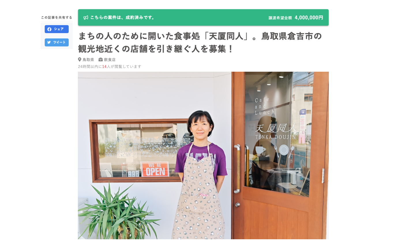 食事処「天厦同人(てんかどうじん)」の第三者事業承継が移住により実現。鳥取県とrelayの共同プログラム「relay the local 鳥取県」による初の成約